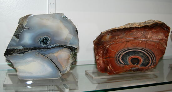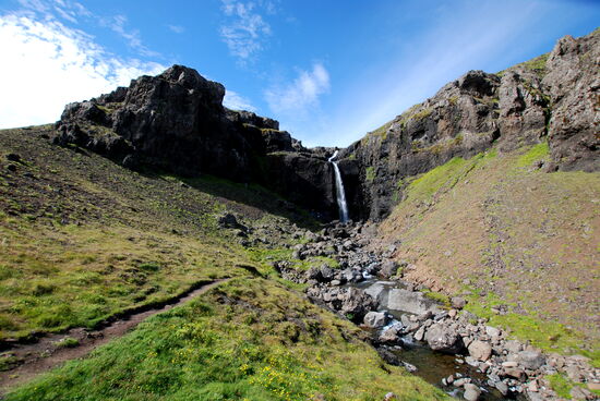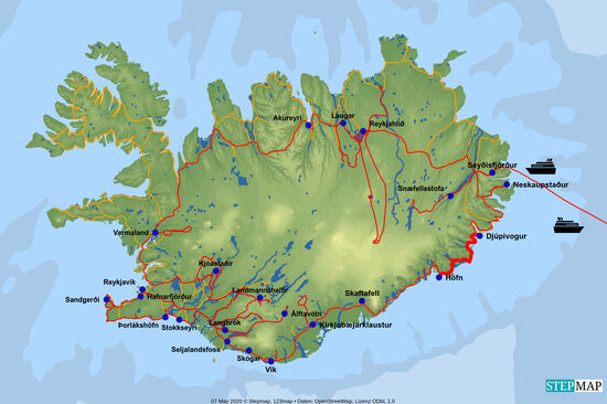 Nach einer ruhigen Nacht wollten wir nur noch einmal in den Ort zum Steinmuseum. Der Betreiber hatte die Steine aber nicht nur gesammelt, sondern er bearbeitete sie auch. Kleinere Steine kommen in Trommeln, die dann 4 Wochen lang rotieren. Danach sind sie wunderschön blank. Andere Steine schneidet er nur durch und poliert sie, oder er schneidet sie in viele schmale Scheiben. Kaufen konnte man diese kleinen Kostbarkeiten aber auch. Wir erstanden einen Obsidian, einen Jaspis und einen Skolezit. Anschließend wurde dann angespannt, und wir fuhren weiter auf der N 1 in Richtung Höfn. Dieser Streckenabschnitt schlängelte sich immer am Meer entlang. Es ging oft über einspurige Brücken und bot herrliche Einblicke in die breiten Flußtäler. Waren die Berge erst weit weg, so kamen sie langsam immer näher. Schön, daß es jetzt so viele Parkplätze gibt. Von einem konnten wir zu einem schönen Wasserfall gehen. Überall waren dicke Polster von in voller Blühte stehenden Thymian. Beim Rückweg entdeckte Christa noch mehrere Büschel Schnee-Enzian. Bald darauf verlief die Straße nun dicht an den steilen Bergen entlang. Verbauungen und Spundwände schützen hier die Fahrbahn vor Steinschlag und Gerölllawinen. Ein Parkplatz ermöglichte es uns, hinunter in die Nähe des Meeres zu fahren. Hier gibt es einen mindestens 200 m breiten Strand aus rund geschliffenen kleinen schwarzen Steinen. Es war nicht leicht, darauf zu gehen. Rainer entdeckte eine entzückende kleine Pflanze, ein Strand-Blauglöckchen. Diese Pflanze wächst nur im Uferbereich um Ísland. Bis Höfn war es nun nicht mehr weit. Der Campingplatz war schon recht gut belegt. Wir fanden noch einen Platz mit Strom und bauten auf, wobei uns unsere Selbstfahrhilfe des Wohnwagens wieder einmal gute Dienste leistete. Hier wollten wir einige Tage bleiben und verschiedene Ausflüge machen.