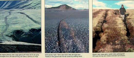 Besonders am Herzen liegt uns das Hochland. Leider benehmen sich viele Touristen nicht so, wie es für die empfindliche Natur dort notwendig ist. Spuren bleiben über Jahrzehnte nahezu unverändert bestehen. So sahen wir noch sichtbare Fahrspuren, die als schlechtes Beispiel auf Schildern im Hochland abgebildet waren. Diese hatten wir schon 2010 fotografiert, und da waren die Schilder schon ausgeblichen.