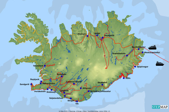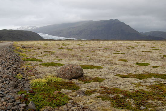 Heute wollten wir uns eine der Gletscherzungen des Vatnajökull anschauen. Wir hatten uns die Fláajökull-Zunge ausgesucht. Von der N 1 führte ein Grusväg mit vielen Schlaglöchern an feuchten Wiesen, einem Fluß und großen Sandern entlang. Überall weideten Schafe. Ein Goldregenpfeifer mit seinem Jungen rannte aufgeregt hin und her. Wir sollten verschwinden!