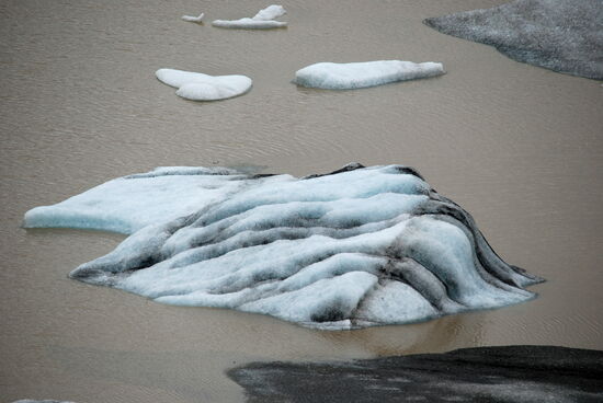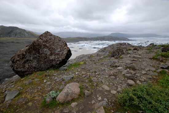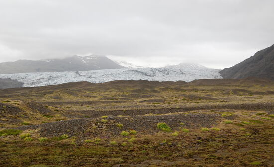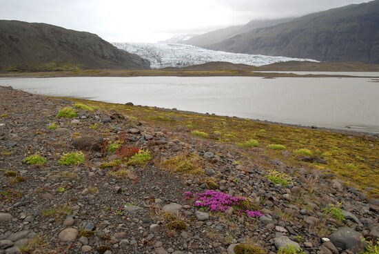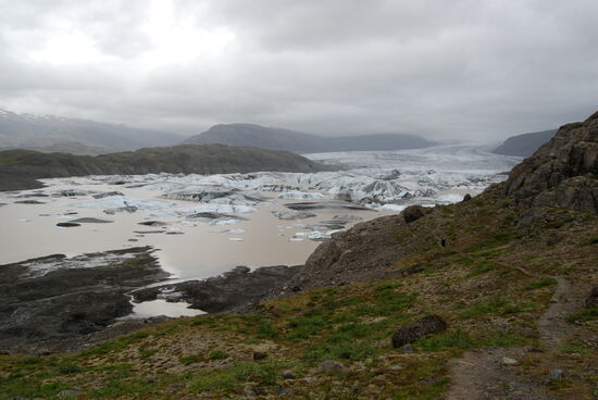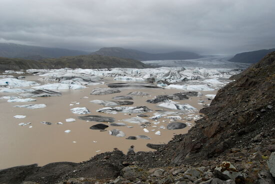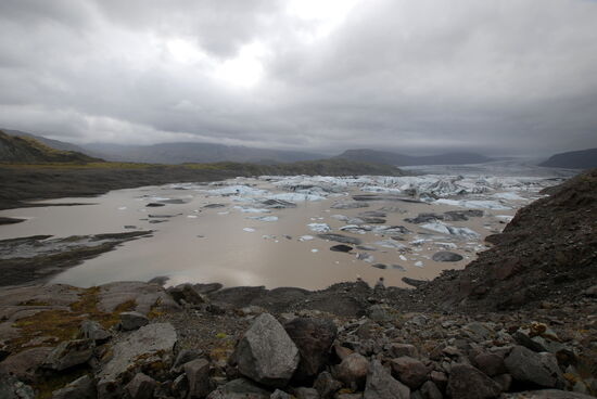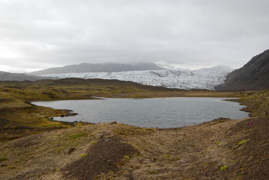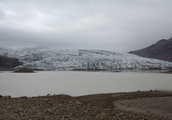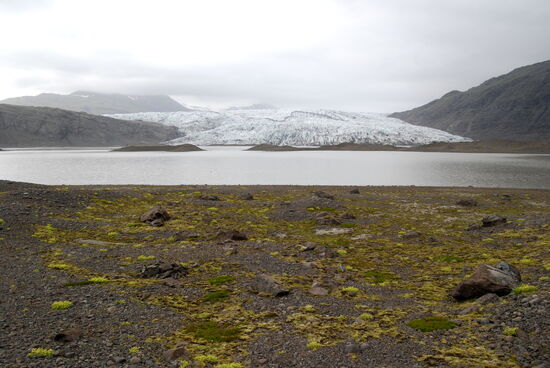 Bald erreichten wir einen Parkplatz mit Toilette. Der Gletscher war von hier aus gut zu sehen, trotz mehrerer Moränen im sehr großen Gletschersee. Auf einem Damm konnte man noch weiter fahren bis zu einem weiteren Parkplatz. Von hier aus wanderten wir eine gute Strecke parallel zum Gletscher, in der Hoffnung noch weiter ans Eis heranzukommen. Das Laufen im Geröll war aber doch recht anstrengend, und so kehrten wir wieder um. Mit Blick auf den Gletscher aßen wir unsere Brote und fuhren dann zurück zur N1. Christa wollte noch gerne zur Hoffellsjökull-Gletscherzunge, wo wir 2010 schon einmal waren. Der Weg dorthin mußte wohl verlegt worden sein. Damals war er leicht zu fahren, nun ging es fast nur durch das Geröllbett eines trockenen Flusses. Am Gletscher angekommen, staunten wir nicht schlecht. Der große Gletschersee war gewaltig abgesunken und war nur noch ganz klein. Auch der Gletscher war ein ganzes Teil zurückgegangenen.