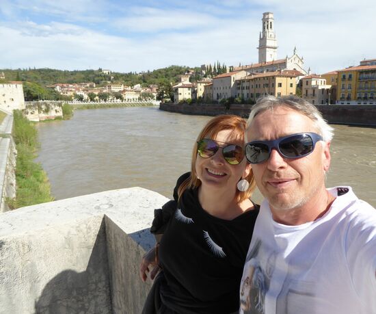 In einem kleinen Cafe mit Terrasse an der Etsch gabs dann endlich etwas gegen unseren Durst und Kaffee und Schokokuchen. Bernadette und ihr Manni saßen zur gleichen Zeit nicht weit entfernt bei einem Aperol vor der Arena und bei ihnen gab es einen heftigen Platzregen .