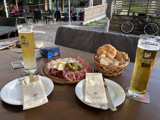 Nach dem Frühstück sind wir nach Sterzing gefahren. Dies ist kurz vor der Österreichischen Grenze. Sehr nett dort. Leider mussten wir unsere Pläne kurzfristig ändern, da Österreich als Risikogebiet eingestuft wurde. Der Plan war also, eine Nacht in Sterzing zu bleiben und am nächsten Tag Österreich ohne Halt zu durchfahren. In Sterzing haben wir ein nettes Gasthaus gefunden, mit renovierten Zimmern und Halbpension. Den Tag konnten wir noch am Pool verbringen, wir hatten strahlend blauen Himmel. Zum Nachmittag gab es eine leckere Jause und endlich gutes Bier! ☺️