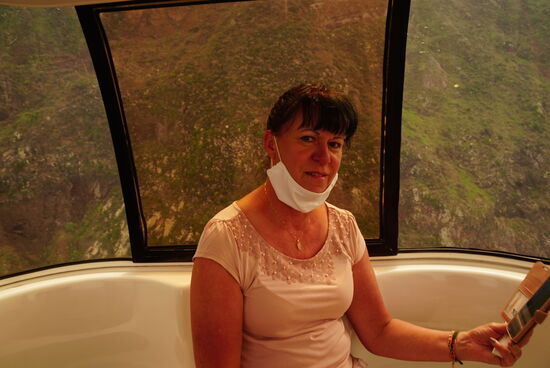 Da gleitet eine Kabine hinab—wir fahren auch runter, steigen aber nicht aus.