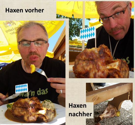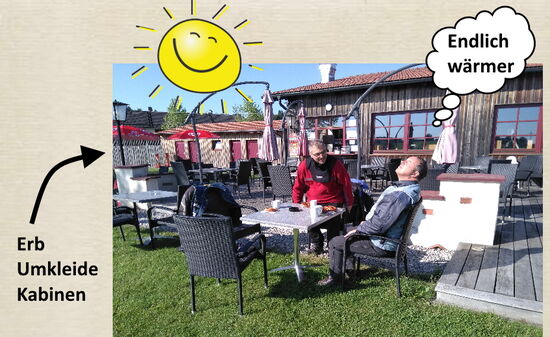 Mit langer Unterhose und langem Unterhemd wurde es auf der Sonnenterasse im Biergarten ruck zuck sehr heiß. Erst einmal raus aus den nun zu warmen Klamotten. Umziehen im Klo war angesagt.