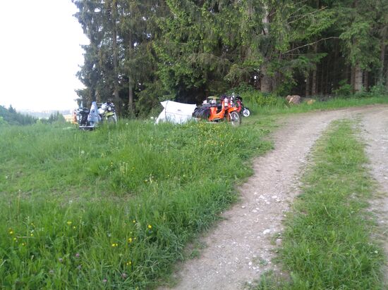 einen geteerten steilen Wirtschaftsweg hoch in den Wald. aber im Wald Campen hat so seine Tücken Unebener Boden etc.