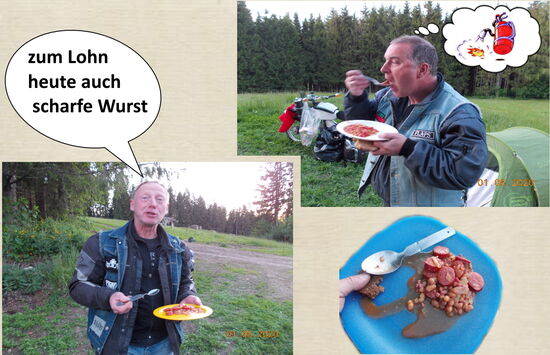 Das Kochgeschirr wurde raus gekramt und zu Abwechslung wurden die Bohnen mit Speck dieses mal mit scharfer Wurst aufgepappt.