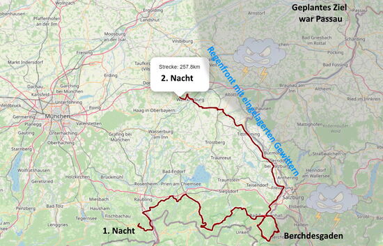 "Richtung Passau regnet es! ... und hier tröpfelt es auch immer wieder. "Jungs Planänderung. Aus Passau wird nichts! Auch im Bayrischen Wald regnet es!"