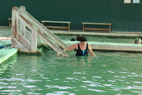 15:00 Uhr fahren wir gemeinsam in ein Thermalbad. Im Nachbarort Zhemchug, etwa 35 Kilometer von Arschan entfernt werden wir in einer natürlichen Quelle mit 40 Grad heißem Wasser baden. Wir sind gespannt, was uns dort erwartet. Durch ein chinesisch aussehendes buntes Tor treten wir auf einen großen Platz mit vielen bunten mongolisch anmutenden Gebäuden. Bunte Farben dominieren hier. Und in den Gebäuden findet man Wannenbäder, Massagen, Banjas oder kleine Restaurants und Kaffees. Der Platz ist natürlich unbefestigt; aber es führt ein breiter Betonweg mittig bis zum eigentlichen Bad. Das sind bestimmt 100 Meter. Rechts und links davon Verkaufsstände für Textilien und Spielsachen. Der eigentliche Aquapark besteht aus mehreren Becken mit heißem Wasser aus natürlichen Quellen, das über Rohrleitungen in die Becken geleitet wird. Alles ist einfach, aber praktisch und die Wärme tut uns gut.