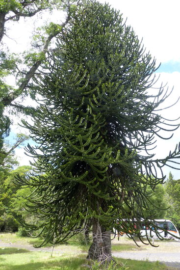 Der Nationalpark wird überragt vom 3776 m hohen Vulkan Lanin. Bekannt ist er auch für seine Seen und die Araukarien.. Leider war am 1. Tag im Park das Wetter oft regnerisch ( der einzige Tag mit Regen auf dieser Reise außer dem 1. Tag auf den Osterinseln). Aber an Tag 2 im Park war das Wetter wieder gut, sodaß wir doch noch den Blick auf den Lanin hatten.