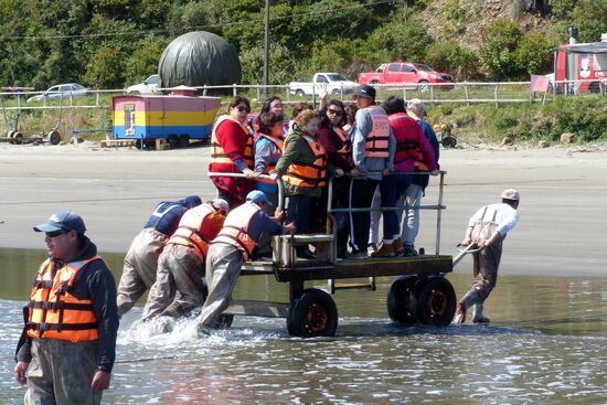 Bevor wir uns die Holzkirchen anschauen wollten, machten wir erst einmal einen Ausflug zur Pinguinkolonie PUNIHUIL. Es waren erst wenige andere Besucher da, sodaß wir nicht lange auf die Abfahrt des Bootes warten mussten, denn die Pinguine halten sich auf kleinen Felsinseln auf und sind nur per Boot erreichbar und aus der Distanz zu sehen. Besonders das Ein- und Aussteigen auf die Boote hatten wir vorher noch nie so erlebt.