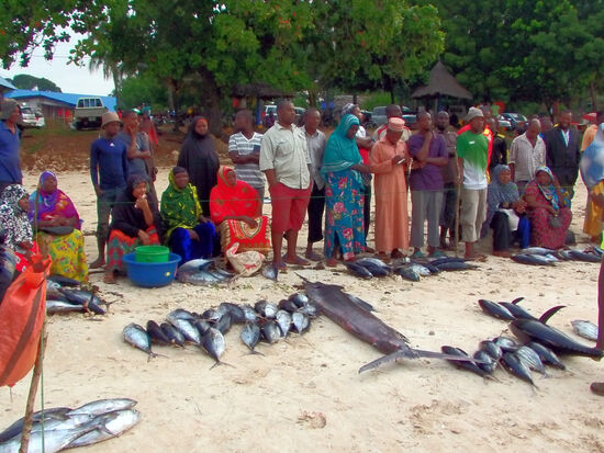 Ich bin jeden Morgen sehr zeitig aufgestanden und habe kurz nach 6 Uhr auf dem Motorrad gesessen, um die Umgebung zu erkunden. Dabei bin ich auf den Fischmarkt in Kizimakazi gestoßen. Der Fisch kommt frisch vom Boot und wird direkt am Strand verkauft.