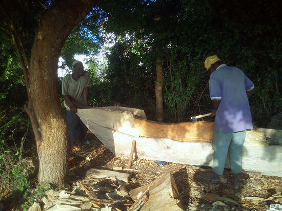Alles wird mit der Axt gemacht. Das obere Brett wird haargenau an das untere angepasst. Immer wieder legt der meister an, zeichnet an und bearbeitet das Holz. ich schaue lange zu und komme ins Reden. Beide Seiten sind aneinander interessiert.