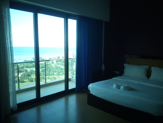 Bis zum Uhuru Hights in Daressalam ist es nicht weit, Zimmer und Bad machen einen guten Eindruck. Noch besser ist der Ausblick auf das Meer, die Schiffe und die Stadt.