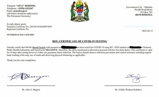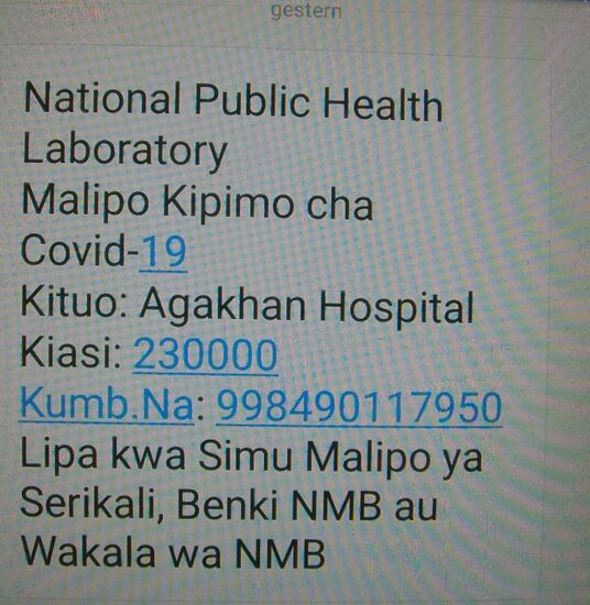 Dann bekommt man auf sein Handy eine Rechnung und eine Bankverbindung von dem Labor, wo der Test ausgewertet wird. Damit geht man zur Bank, zahlt den Betrag, in meinem Fall 230.000 TZS, auf das Konto ein und bekommt wieder eine Quittung auf sein Smartphone. Das macht die Bank automatisch in sekundenschnelle.