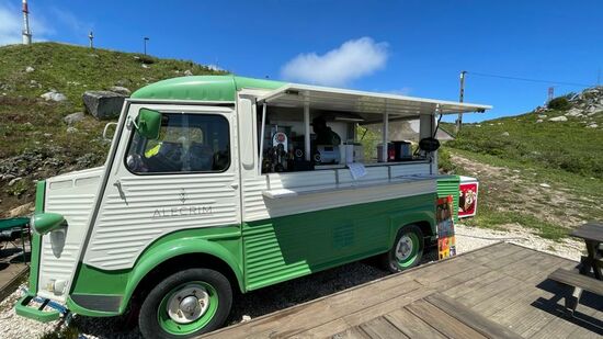 Wir wandern etwa 1,5 Stunden bis zum Gipfel. Dort kehren wir auf ein Stück Nusskuchen und einen Kaffee in das große Restaurant ein.