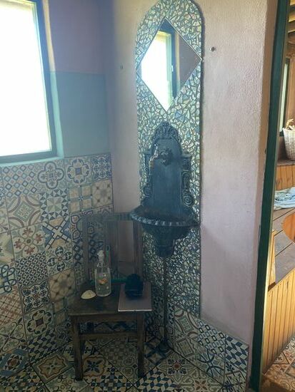 Im angrenzenden Raum können wir duschen—den schweren Gußdeckel des Ofens müssen wir mit einem Schürhaken öffnen