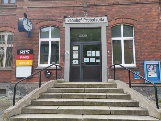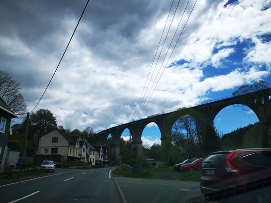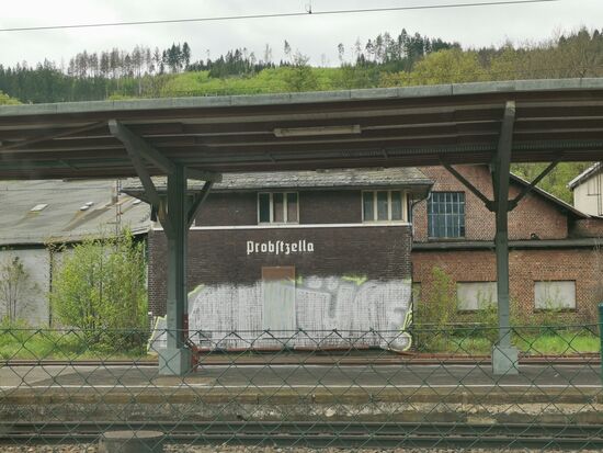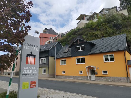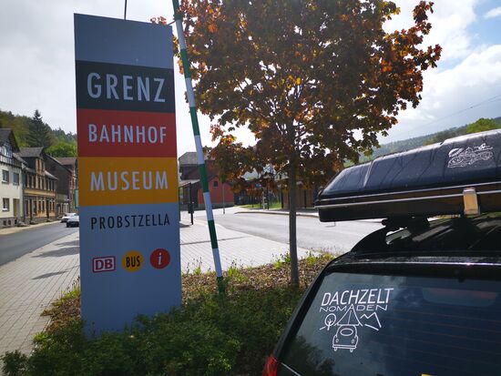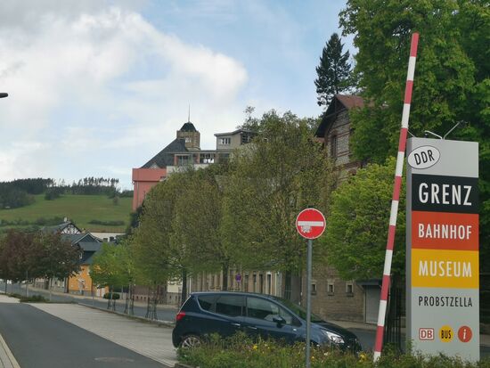 Dann erreiche ich den Grenzbahnhof Probstzella im Thüringer Schiefergebirge. Hier ist alles wie ausgestorben. Die Häuser gegenüber vom Bahnhof wirken trist und verlassen. Nach einer kurzen Mittagsrast (dank Corona - IM AUTO ) fahre ich im Ort noch nach oben - Richtung "Haus des Volkes", ein Hotel/Restaurant/Veranstaltungsstätte (https://bauhaushotel.com/). Oha, hier sind die Straßen teilweise so eng, dass sich zwischen einer Mauer auf der einen Seite und einer Hauswand auf der anderen Seite des Autos nur noch wenige Zentimeter Luft befinden. Wieder einmal bin ich froh, kein Wohnmobil zu fahren Ich muss wohl kaum erwähnen, dass auch hier oben "tote Hose" herrscht.