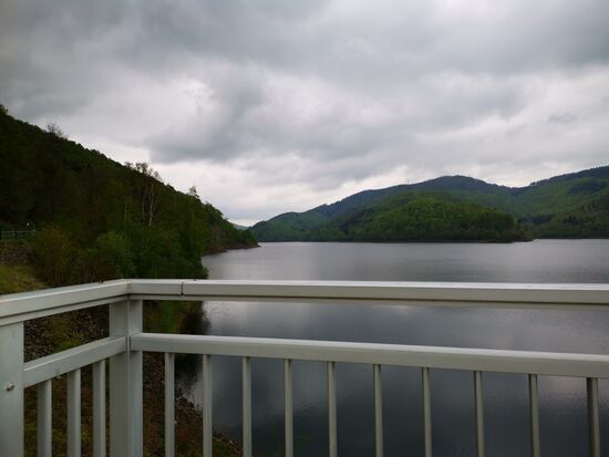 Ich passiere die Odertalsperre, die auch auffällig niedrigen Wasserstand hat. Die regenarmen letzten Jahre hinterlassen überall ihre Spuren.