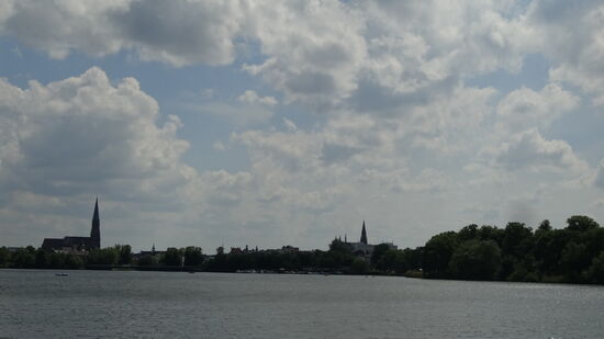 Ein erster Lauf führte uns an die Abfahrtsstelle beim Schloss zu einer Bootstour mit der weissen Flotte, pro Person 17 € für 1,5 Stunden durch die Seenlandschaft. Da wir auf dem Sonnendeck sitzen wollten, mussten wir auf die nächste Abfahrt um 14.30 Uhr warten. Bei Bierchen und Aperol, verging die Zeit aber recht schnell.