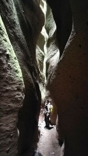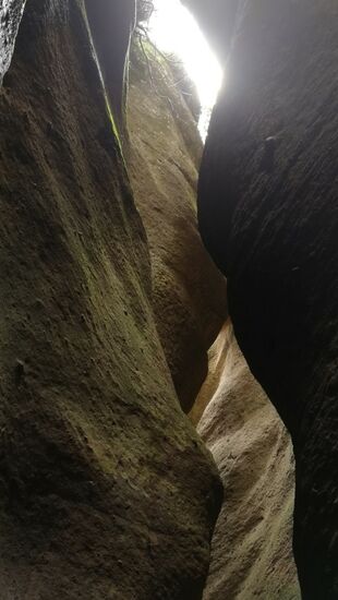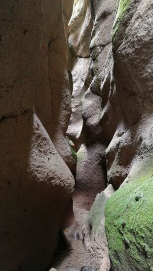Irgendwann hören wir Geräusche und erstarren - was ist das bloß!? Wir horchen weiter und tippen auf Fledermäuse. Nun fängt unsere Phantasie an rum zu spinnen: was ist, wenn wir sie verschrecken und sie uns in der schmalen Spalte entgegen fliegen?? Auch wenn ich eine kleine Fledermaus in Peru, Tarapoto bereits in den Händen hielt, während ich sie aus einem Pool rettete, gefällt uns die Vorstellung flatternder Fledermäuse über unseren Köpfen ganz und gar nicht. Wir beschließen spontan, genug gesehen zu haben und treten den Rückweg an.