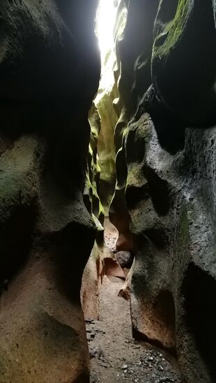 Irgendwann führt der Weg durch eine kleine Grotte, in die kein Sonnenlicht gelangt. Hier wird es richtig unheimlich! Die schwache Taschenlampe in Carlos Hand scheint den Geist aufgegeben zu haben, die Handy-Taschenlampenapp wirkt wie ein Spielzeug ohne Funktion.. Also hole ich aus dem Rucksack meine 10 Jahre alte superlichtstarke Taschenlampe heraus ist ziele damit in die Dunkelheit. Yeear, jetzt sehen wir was und können weiter gehen