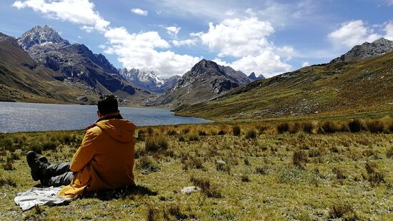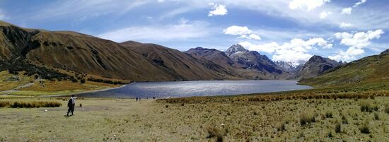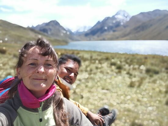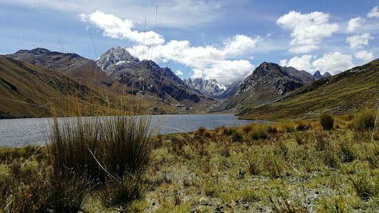 Den nächsten Halt machen wir an der Laguna Querococha, für die wir 20 Minuten Zeit bekommen. Die meisten Mitreisenden gehen bis zum Ufer der Lagune. Wir suchen uns ein nettes Plätzchen und setzten uns auf die Wiese zwischen den Gräsern und den vielen schwarzen, kugeligen Hinterlassenschaften von... vermutlich Schafen oder Ziegen? Vor uns die eindrucksvolle Landschaft mit der Lagune, den weiten Wiesen, Hügeln, Bergen und schneebedeckten Felsen der Cordillera Blanca. Am Himmel ein paar weiße Schönwetterwölkchen, die das wundervolle Panorama noch schöner erscheinen lassen. Wir sind auf 3980 Metern über dem Meeresspiegel. Der frische Wind streift über unsere Gesichter und wir atmen die frische Briese genussvoll ein - was für ein wundervoller Moment.