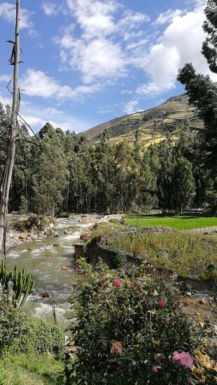 Obwohl die Lagune auf nahezu 4000 m liegt, haben wir den höchsten Punkt unserer Fahrt noch nicht erreicht. Wir steigen kontinuierlich weiter, eine Kurve nach der nächsten, bis wir auf 4516 m durch einen 500 Meter langen Tunnel auf die andere Seite der Cordillera Blanca gelangen. Danach geht es kurvenreich runter, bis wir auf etwa 3000 Höhenmetern den Ort Chavín de Huántar erreichen. Bevor es jedoch zum Höhepunkt der Tour geht, halten wir zunächst an einem Restaurant an: Mittagspause. Carlos verdrückt schnell ein Caldo de Gallina während ich mir Knabberzeug an einem Minimarkt hole. Den Rest der Pause verbringen wir draußen. Wir sitzen oberhalb eines Flusses und genießen die Natur um uns herum.