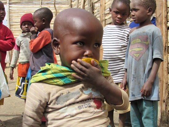 Dann verteilen wir die Orangen - die Mädchen und Jungen sind unglaublich hungrig und so strecken sich uns viele kleine Hände entgegen, die Angst haben nichts ab zu bekommen.