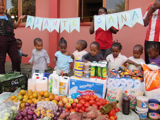 Im Cradle werden wir bei Ankunft schon erwartet. Gemeinsam wird alles ausgeladen und für das Gruppenfoto dekoriert. Das ist hier Brauch - damit sagt man den Sponsoren von ganzem Herzen "Asante sana".