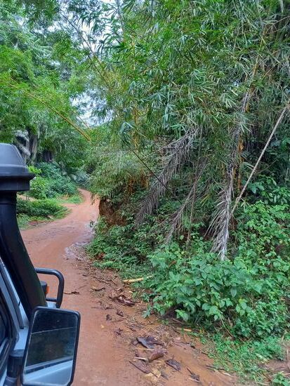 Schließlich verlassen wir die gut ausgebaute Straße und es geht auf typischer Sand und Schlagloch Piste weiter.