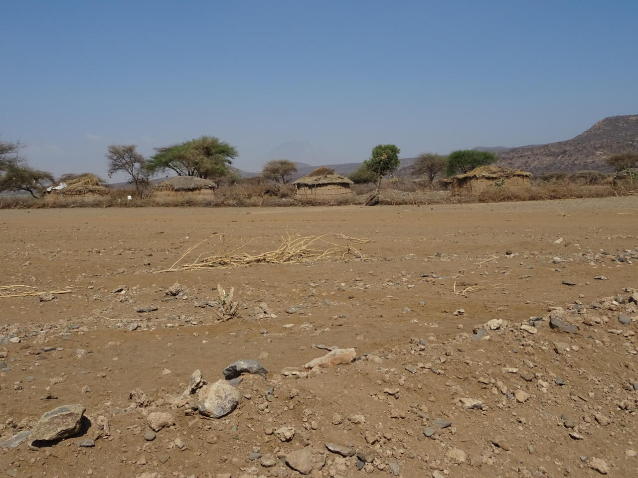 In der Ferne sind immer wieder die typischen Massai Dörfer zu sehen. Lehmhütten umgeben von einer Dornenhecke.