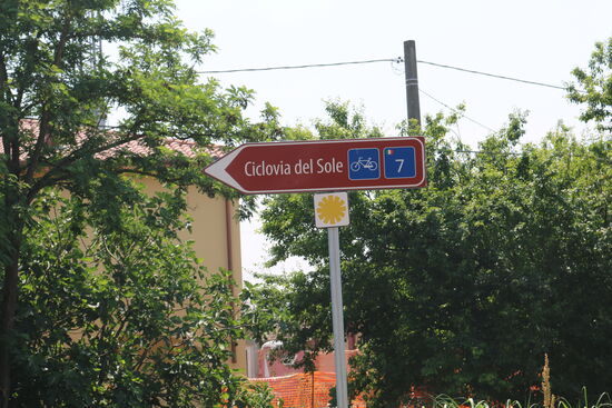 Dann ging es mal wieder über das Land entlang vieler Bewässerungskanäle, bis ich nach Mirandola kam. Dann noch kurz durch ein Industriegebiet und dann war ich am Bahnhof Mirandola. Jetzt wurde es für den Abschluss der Tour noch einmal richtig schön. Denn es ging auf den Ciclovia del Sole, einem recht neuen Radweg auf der alten Bahntrasse zwischen Mirandola und Bologna. Da ich ja auf dem Sonnenradweg unterwegs war, gab es heute mal keinen Regenschauer.