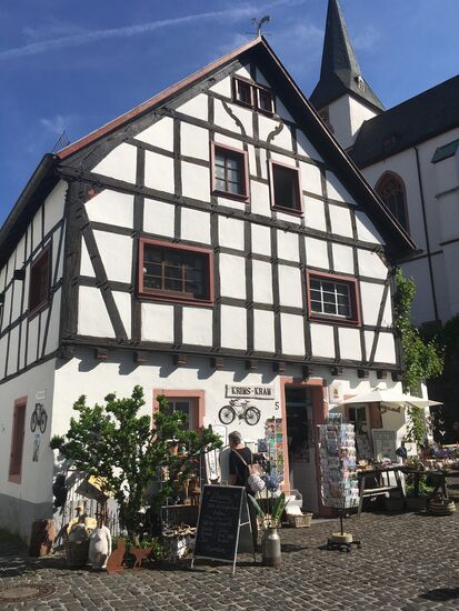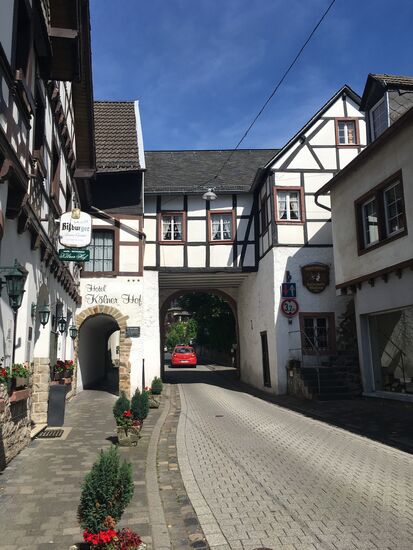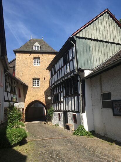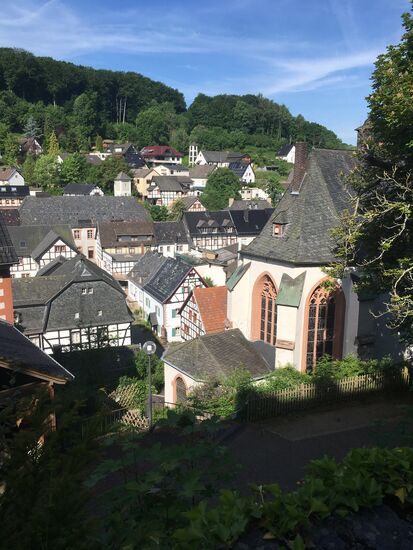 Wir beschließen die Burg zu Fuß zu erklimmen und steigen an weiteren Fachwerkhäusern allmählich hoch. Allmählich ergeben sich schöne Ausblicke auf den malerischen Ort. Viele Stufen machen dem Knie meiner Frau Ulrike zu schaffen.