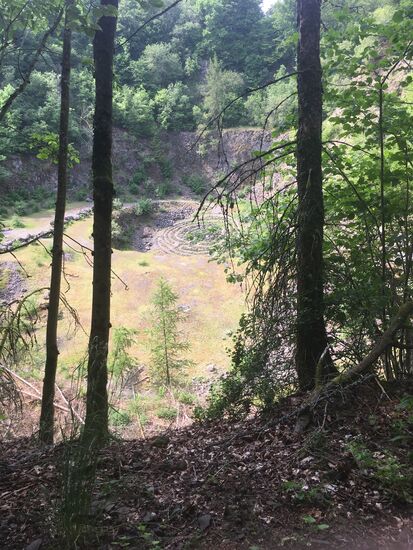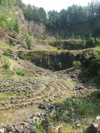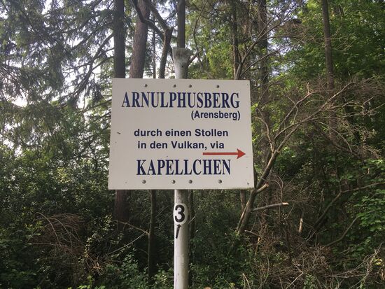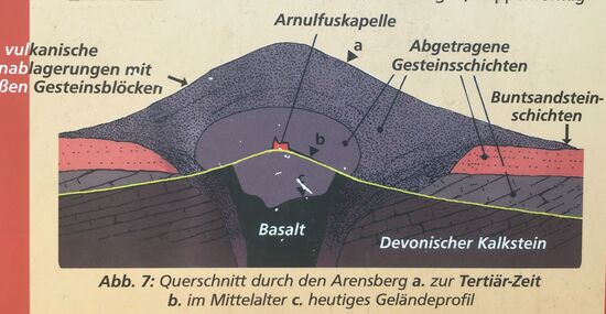 Früher war der Arensberg deutlich höher. Während an den alten Aschenablagerungen des ersten Ausbruchs die Jahrmillionen zehrten, waren es dann im 19. Jahrhundert die Menschen, die dem Berg seinen Gipfel nahmen. So musste auch die Ruine einer mittelalterlichen Kirche dem Basaltsteinbruch weichen. An sie erinnert heute die kleine Kapelle am Wegesrand. Nach und nach drang man immer tiefer in den Berg vor und folgte dem Schlot in die Tiefe. Heute bietet sich im alten Steinbruch ein beeindruckender Blick in das Innere eines erloschenen Vulkans.