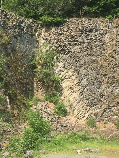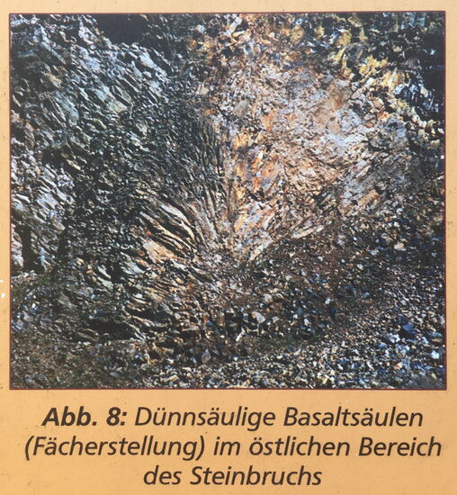 Mit großer Wucht werden die Bruchstücke aus dem Schlot geschleudert und vermischen sich mit dem Ascheauswurf. Bis heute sind an den Abbruchkanten im Steinbruch die helleren Gesteinsblöcke inmitten der dunkleren Aschenablagerungen sehr gut zu erkennen.