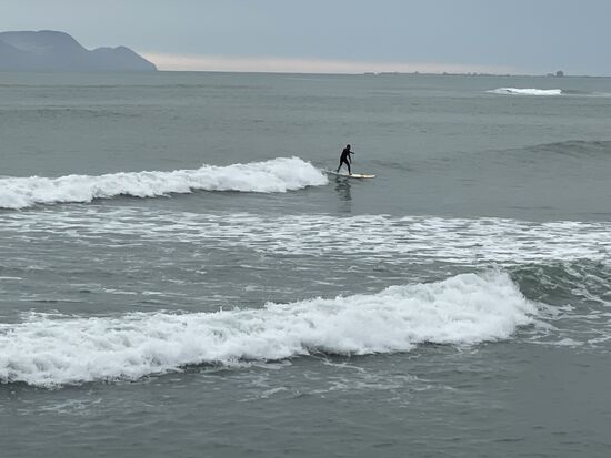 Zum Kaffee setze ich mich an einen der hohen Tische auf dem Balkon und sehe den Surfern zu, die sich durch die Wellen hinaus kämpfen und mit den Wellen zurück an den Strand reiten.