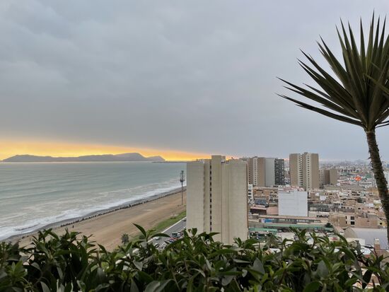 Am späten Nachmittag bin ich zurück zu Hause. Weil es kurz so aussah, als ob sich die Sonne noch zeigen könnte, fahre ich mit dem Lift hinauf aufs Dach. Der Bereich des Pools ist noch immer geschlossen, aber auf der Seite kann ich einen Blick hinaus aufs Meer ergattern. Die Sonne ist allerdings hinter der dicken Wolkenschicht geblieben und schickt nur noch einen hellen Schein über die Insel San Lorenzo vor der Küste.