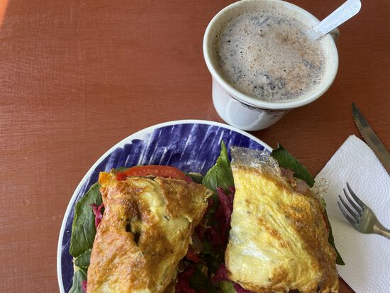 Am Morgen gehe ich in das kleine Café neben dem Hotel und als ich sehe, dass es auch Frühstück serviert, bestelle ich das normale Angebot. Und bekomme ein wunderbar ungewöhnliches Frühstück.
