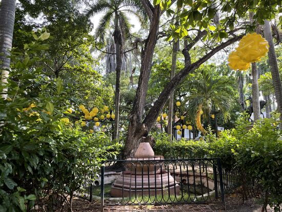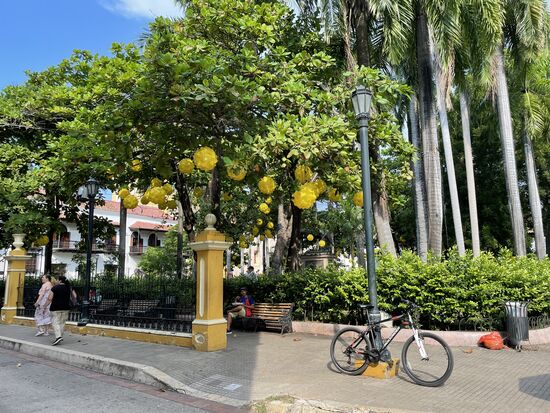 Die Kathedrale ist geschlossen, aber sie ist riesig. Ich komme gar nicht mehr aus dem Staunen, die Stadt ist wunderschön. Was mir vor allem gefällt, sind die satten warmen Farben. Natürlich muss ich auf alle Seiten fotografieren. Zwischen den langen Häuserreihen liegen kleine Parks mit hohen Palmen und dichten Bäumen, Statuen und lauschigen Plätzchen. Auf anderen Plätzen gibt es Tische und Stühle mit Cafés und Restaurants.