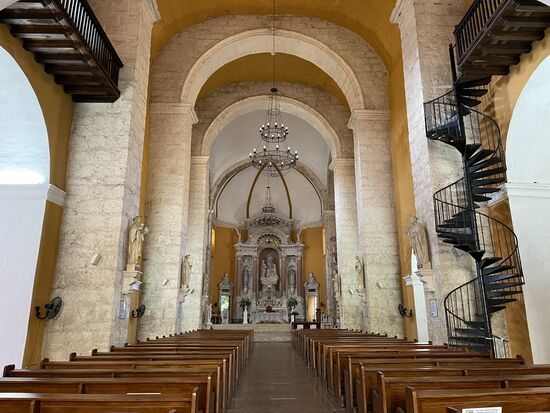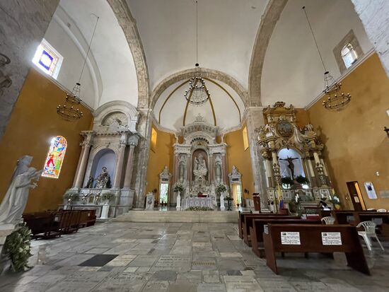 Die Kirche, die dem Platz den Namen gibt, ist geöffnet. Es ist ein hoher behäbiger Raum mit breiten runden Bogen und schweren dicken Säulen.