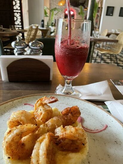 Ganz in der Nähe finde ich ein wunderschönes Restaurant, das mich unwillkürlich anzieht. Es gehört zu einem Boutique Hotel und scheint eines der besten zu sein. Jedenfalls ist schon die Begrüssung äusserst herzlich und die Tische sind aufgedeckt mit Sets, Besteck und Gläsern. Das sieht man hier kaum. Die Bedienung ist zuvorkommend. Ich bestelle einen Fruchtsaft aus Coroza. Das ist eine rote karibische Frucht, ähnlich unseren Kirschen. Dazu ein paar Crevetten mit Reis. Genau das richtige hier, schliesslich bin ich am Meer.
