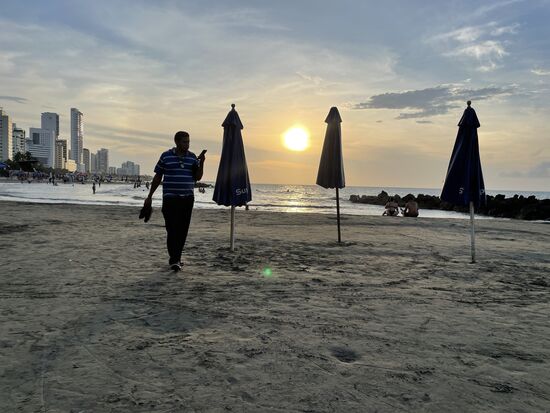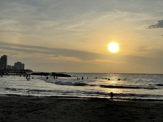Die Fenster sind riesig, die aufgehende Sonne weckt mich um sechs Uhr und kurz darauf stehe ich wieder auf dem Dach. Der rote Feuerball steigt über der Bucht von Cartagena auf und taucht die ganze Bucht in ihrer oranges Licht. Kurz darauf verschwindet die Sonne wieder hinter ein paar tief liegenden Wolken und genau das mache ich auch, schlüpfe wieder unter die Decke, lasse den Tag langsam kommen.