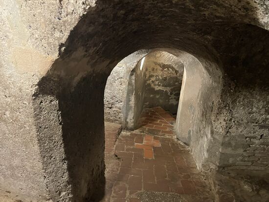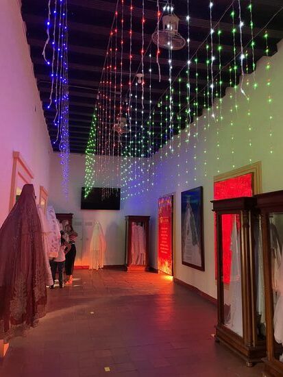 Viel kann man vom Kloster nicht sehen, aber der Klosterhof mit seinem Kreuzgang und den eleganten Bögen ist sehr schön und wurde vor ein paar Jahren restauriert. In einer der Kammern, in denen es verschiedene Gemälde gibt, wird ein speziell beleuchtetes Bild der heiligen Familie gezeigt. Ob das nur jetzt zur Weihnungszeit so beleuchtet ist, weiss ich nicht. Jedenfalls ist der ganze Raum mit unzähligen Lämpchen beleuchtet, die dauernd die Farbe wechseln. Gut möglich, dass das Teil der Weihnachtsinszenierung ist.