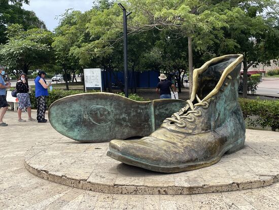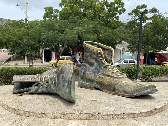 Zurück in der Stadt, zeigt er mir das Denkmal mit den alten Schuhen. Es ist einem wichtigen Poeten aus Cartagena gewidmet. Luis Carlos Lopez (1879 - 1950). In seinem Gedicht An meine Heimatstadt schreibt er, dass man für die Stadt ein Gefühl entwickelt wie zu einem alten Paar Schuhe. Darum stehen nun seine Schuhe hier auf dem Platz in der Nähe der Festung San Felipe und die Touristen stehen Schlange davor. Jeder will einmal in die Schuhe steigen und ein Bild davon nach Hause nehmen. Mir reichen die Schuhe, mich selber brauche ich da nicht auch noch drauf zu haben. Dafür brauche ich nicht anzustehen, muss nur den nächsten Personal-Wechsel auf der Plattform abwarten.