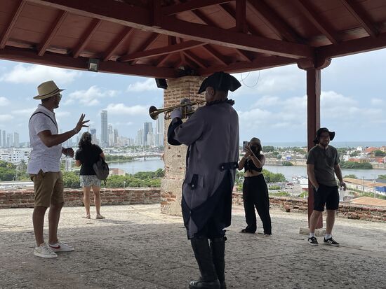 Von einer Plattform über mir höre ich eine Trompete. Ob das eine Show ist. Als ich oben ankomme, ist der Trompeter grad dabei, sich ein paar zusätzlichen Propinas zu verdienen. Er gibt das Posing vor, wie er Leute erschreckt und natürlich wird er eifrig fotografiert. Es reicht nicht mehr, ein paar Töne in die Luft zu blasen und eine historische Uniform zu tragen. Zusätzliche Fantasie ist gefragt.