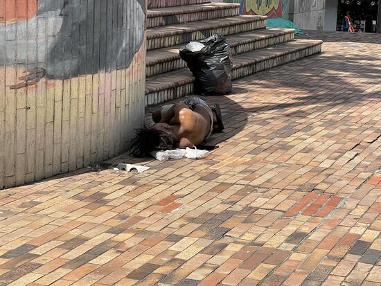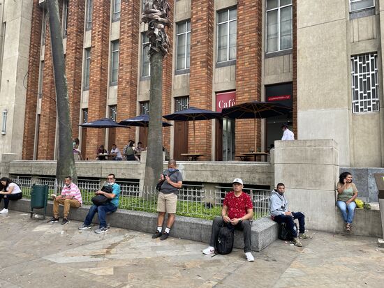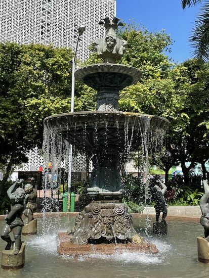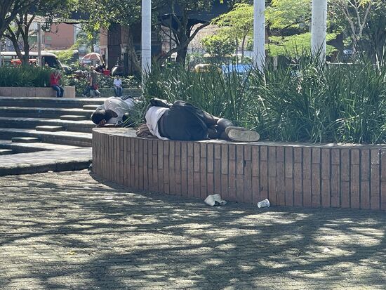 Vorher besuche ich noch einmal den San Antonio-Park, der ganz in der Nähe ist und wo ich gestern den verwundeten Botero-Vogel entdeckt habe. Heute finde ich da ein paar Menschen am Boden. Schlafend. Ich will mich nicht an diese Sicht gewöhnen, darum muss ich sie fotografieren, will mich diese Seite der Stadt nicht vergessen lassen.