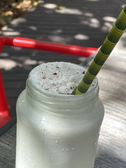 Er wird mit viel Eis, grünen Limonen, etwas Zucker, Kokosmilch und vielen Kokosraspeln, hier natürlich von frischen Kokosnüssen, gemacht.