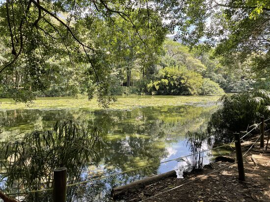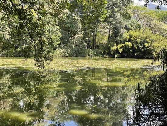 Nach den Schmetterlingen gehe ich zum kleinen Weiher. Es ist schön, sich bereits auszukennen. Beim ersten Mal musste ich alles zwischen den Bücherständen suchen, fast hätte ich damals den Weiher verpasst. Heute blühen die vielen Seerosen auf dem Wasser. Es sind nicht viele Besucher da, es ist ruhig. Ich setze mich auf eine Bank und da kommt auch tatsächlich schon bald ein Leguan angekrochen. Ich bin fasziniert, schaue ihm lange zu, wie er langsam über das Laub kriecht, mit seinen grossen Zehen manchmal etwas Essbares hervorkratzt und wieder lange stehen bleibt. Seinen Kopf nach allen Seiten hebt so dass man seinen grossen Halslappen sieht.
