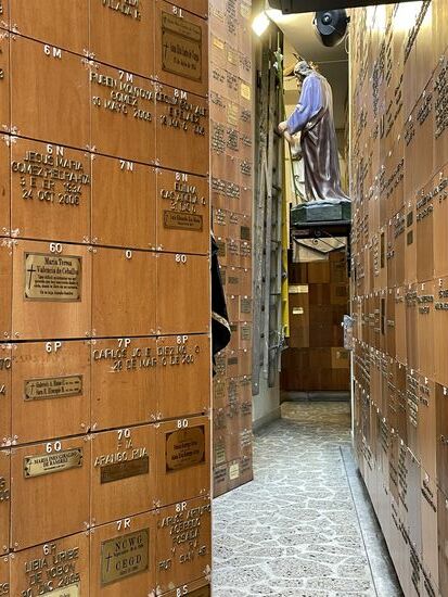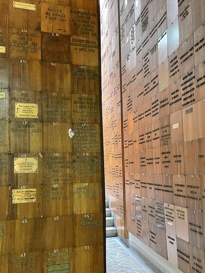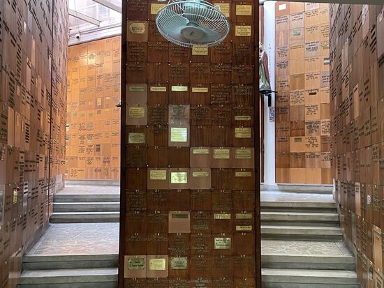 Und dann sehe ich ganz vorne eine spezielle Türe, vor der ein Mann betend kniet. Dahinter scheinen Gedenktafeln zu sein. Ganze Mauern voller Gedenktafeln. Ein Urnenfriedhof?. Ich frage einen Mann, der grad heraus kommt. Flüsternd. "Ist das ein Friedhof?" "Nein", meint er ebenso flüsternd. "Aber eine Gedenkstätte. Da drinnen sind die Urnen von Toten aufbewahrt." Und ja, ich dürfe da selbstvertändlich hinein gehen.