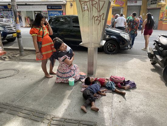 Also weiter, ich will ja nur zum Botero-Platz. Kurz vor der letzten Strassenkreuzung laufe ich an zwei kleinen Kindern vorbei. Sie liegen da auf der Strasse. Mitten auf dem Trottoir. Schlafen. Eine Frau zetert daneben. Zuerst glaube ich, sie sei die Mutter und rege sich ob der Leute auf, die stehen geblieben sind. Aber nein, sie regt sich auf, dass man Kinder einfach so liegen lässt. Dass man sie allein lässt. Sie versucht, die Kinder zu wecken, aber die schlafen tief, lassen sich nicht aufwecken. Kurz darauf hat die Frau ihr Ziel gefunden. An der Hauswand, ein paar Meter entfernt hocken zwei junge Frauen, ja fast selber noch Kinder. Sie scheinen zu den beiden Kindern zu gehören, doch das ganze Geschrei prallt völlig an ihnen ab. Es ist, als ob sie in einer anderen Welt lebten, als würde alles, was hier und jetzt auf dieser Strasse passiert, sie überhaupt nichts angehen.